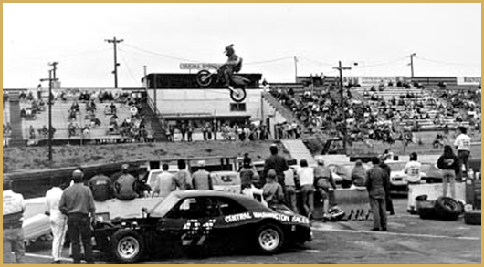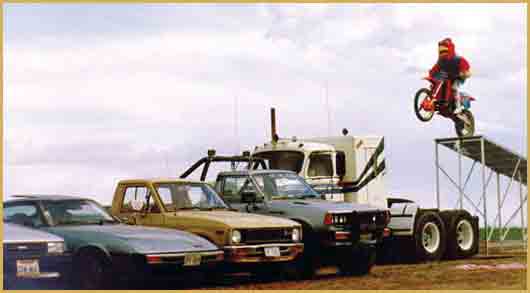 Todd would then get up to the theme from "Rocky"; the movie and jump 13 to 17 cars! Todd personally didn't care for the chicken suit, but he put so much time in it, he had to see it through. The chicken head was made from a Bell MOTO #3. The beak was where he looked through. The kids absolutely loved it. Todd admitted it was very entertaining and thrilling to watch. You laughed and then held your breath. The promoters loved it and Todd negotiated more $ for the next year's shows. Todd only did the Rocky thing for a year until he crashed...not good when a stunt guy bails even worse when a beloved chicken bounces off the speedway @ 70 mile per hour. The drag on the head was insignificant at the speeds Todd was jumping ... it was a little top heavy, however.