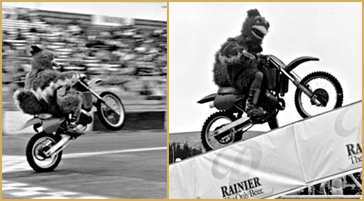Todd Freeland AKA "Rocky the Rooster" — United States Todd Freeland started jumping motorcycles in 1987. He had a handful of shows and met a few promoters. During this time Todd met with a promoter that operated a monster truck show that toured the northwestern United States. The promoter liked his stunts but suggested that if he could do more on the lines of entertaining the audience he would have a better chance at a contract. So Todd came up with the Rocky Mountain Rooster idea to get the audience into it. It worked like a charm. He would come out wheeling and go up the ramp and scope it, then try to get out of the facility...and hide in the crowd...the emcee would then make him go back to his bike and persuade him he had to jump as not to let the people down. The PA would start playing "It's my party and I'll cry if I want to". He would call Todd "chicken"! Todd then would faint...the emcee would then get the crowd chanting "Rocky jump, Rocky jump" once the crowd was respectfully into it, the theme to ABC's Wide World of Sports would play on the PA.