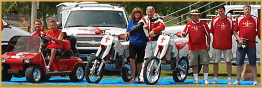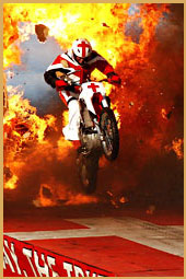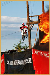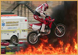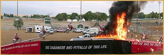 Above Photos: Gene's last jump for the 2005 tour. In 1978, the Lord called Gene back into the motorcycle stunt business by using his skills to share the good news with the lost. This was the beginning of the Jump for Jesus ministry that has been going strong ever since. Gene went to be with the Lord on June 30, 2025. To read more about Gene and his testimony, visit jumpforjesus.net