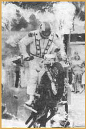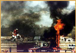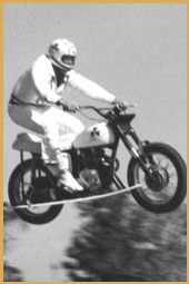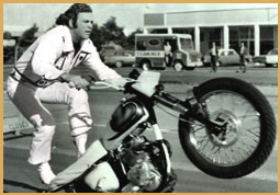 Left: Crashing through a wall of fire on the landing ramp. Right: Gene demonstrating his record setting wheelie skills for the San Francisco Examiner in 1971. Gene was promoting "Cycle Circus" at the Cow Palace which featured Gene and stunt legends Bob Gill and "Super Joe" Einhorn.