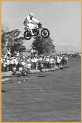 Gene Sullivan's World Record "Hydra Cycle Premier" jump. Gene jumped 180 ft. with his ski equipped Triumph 500 into Argile Lake, Sacramento, California on September 3, 1972.