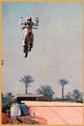 So in the early 80's Robbie went out on his own. He planned to top every one of his father's record for jumping motorcycles and he has. Robbie's career has skyrocket! He has jumped everything from the fountains at Caesars Palace, 17 semi-trucks with no hands, a portion of the Grand Canyon, building-to-building jump at the Polo Club in Vegas, 25 trucks, a moving train, a flying airplane for the television show, "CHiPs", 30 limousines, 24 Coke Zero semi-trucks at Kings Island and more!
