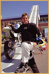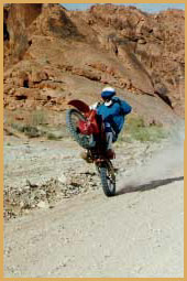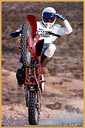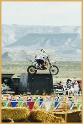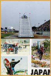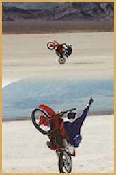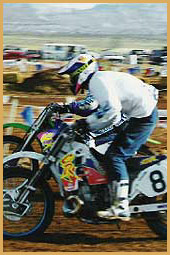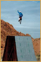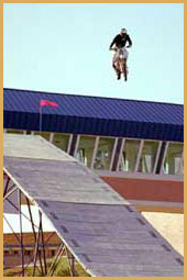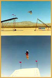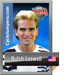 Butch Laswell — United States Butch Laswell was born in Las Vegas, Nevada and grew up in Overton, Nevada. Inspired by Evel Knievel, Butch built ramps and began jumping his bicycle over the family car at the age of 12! His parents finally gave in to this "motorcycle obsessed" boy and bought him his first motorcycle at the age of 15. Two years later he was one of Nevada's top desert racers and by the age of 19 "professional", competing in California and Utah as well. But for Butch,the desire of his heart was jumping. He found himself once again constructing a set of ramps and he began doing small town shows. He jumped Cameros, school buses, 18 wheeler trucks (end-to-end) and gave a great "wheelie" show! By 1980 Butch was seeking a bigger challenge... breaking the World's Long Distance Jump Record of 176 feet! On a late afternoon in April 1981, on the Mormon Mesa in Nevada, Butch took his 440 Maico full throttle to 80 mph and jumped 180 feet! Soon after, Butch quit his "day job" to pursue his motorcycle career full-time and found himself taking motorcycle stunts and ramp-to-ramp jumping to startling new heights. His dreams were not about riding motorcycles — he dreamed of flying through the air mounted on them! All through the 80's Butch established jump records, created stunt innovations and performed death-defying show stunts. He teamed up with Johnny Airtime as "Donnie Airtime/The Airtime Brothers", filmed a TV commercial for the US Coast Guard, filmed a World Record Wheelie demo for the TV show, "That's Incredible" and at some point gained the nickname "Leap 'in Laswell"! He then spent several years working for the Globe of Death tours where he was an overnight superstar in Aruba, Mexico, Taiwan, Japan and Hawaii. He performed a variety of motorcycle illusions and stunts never before attempted. When he tired from traveling, Butch found the bright lights of Las Vegas centered on him, as he starred in the award winning show at the Riviera Hotel, "SPLASH". He also continued to do small shows where he jumped over the Globe of Death and jumped buses no-handed! The 90's brought feelings of making a new start. Butch was serious about his career. He built and maintained his own equipment, even studied the flight pattern of eagles and carefully calculated every aspect of his business. Butch began to approach motorcycle jumping with a new and revolutionary concept. Long distance jumping had been around since the beginning of time, he had broken the world's record twice for distance... why not pioneer high jumping? In january 1992, at Vacation Village Hotel in Las Vegas, Butch Laswell, "The Original Motorcycle HIgh Jumper" established the world's highest motorcycle ramp-to-ramp aerial jump EVER! The record was now set at 41 feet from the bottom of the lowest point on the motorcycle to the ground. It was now 1996 and time for something very special. Butch had 5,000 successful jumps under his belt. By successful, I mean - he had NEVER crashed while jumping! Unbelievable, I know- but true. He was very careful, very precise; everything carefully planned, studied and calculated. After a year of preparation, it was time to call Guinness Book of World Records to town, contact two movie production companies and the media to announce that history would be made and documented on March 10, 1996 in Mesquite, Nevada. It was a stunt that would launch Butch into the movie business and celebration of the "Grand Opening" of the Oasis Casino! Butch would jump the Skywalk Bridge, which crossed above the street that separated the parking garage from the casino. He would officially set the word's record for height. Now, in front of 10,000 spectators, the Guinness World Record officials and all kinds of movie and media personnel, Butch had a problem he could not control - the weather. The wind was gusting and was unpredictable this day. Butch stalled for quite some time, performing extra "wheelie" demonstrations, waiting and praying. He had canceled shows in the pat due to wind, but after such intense planning to gather everyone together; he decided to proceed with the jump. He accelerated his bike to 70 mph, hit the ramp and was launched 55 feet high - into the heavens it seemed. Then, while in the air, a crosswind caught and pushed him from the side. He was now able to see over the walkway to his landing ramp on the other side - the wind had moved him several feet away from his ramp and there was no way to get back. Butch's landing ramp was now the pavement, a crash landing, witnessed by our nation as they watched the nightly news. His first crash was his last- his life was lost at the age of 37. Butch was laid to rest at the Paradise Memorial Gardens in Las Vegas, Nevada. He is survived by his mom and dad, his sister Marilynn and his three brothers, Greg, Nathan and Steve. He left behind no children. A special thanks to the Laswell family for sharing Butch's biography and photos with CycleJumpers.com and the cycle jumping fans throughout the world.