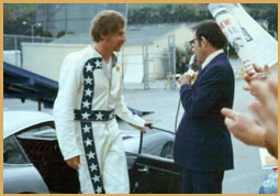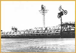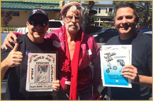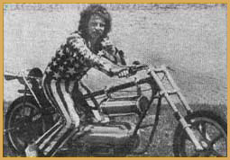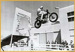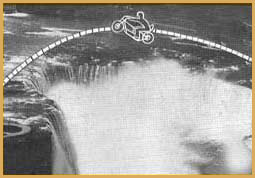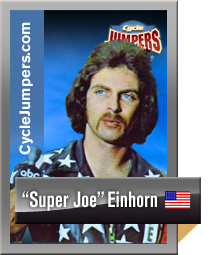"Super Joe" Einhorn — United States Joe Einhorn grew up and was raised in San Pablo, California. He was a son of a naval officer. "Super Joe's" daredevil career began when his sister bought him a little Honda for his 14th birthday. For a long time he wanted to be a professional baseball player then a professional motorcycle racer. Einhorn decided to try racing. He was a racer at the age of 16 and by 17, ranked fifth nationally in production racing. In 1970 he won every race he entered, but was broke. He also was married to a woman named Irene and they had a son named Eric and he also had two daughters Shasheen and Monica. By the time he was 22, he was recently divorced and had two ill-fated careers as a motorcycle racer and salesman. Just to make enough money for lunch, Joe would perform stunts for his co-workers. After making jumps for his friends he would collect as much as $40 dollars. This sparked an idea in Joe's head, he can make money doing this stuff. So he decided to pursue a career in the world of stunt performing. Joe became very successful at jumping motorcycles. He even challenged Evel Knievel to a jump off in Oakland, California for $25,000. The jump off would have started at 16 cars and the number would increase until someone crashed. Evel turned down Joe's offer. (The above two photos are from Louis "Rocket" Re's collection.) In San Jose, California in 1971, ABC's "Wild World of Sports" covered "Super Joe" jumping his Triumph 650 over 20 cars. This brought even more recognition to him. He crashed many times over his career as well, four of his crashes knocked him unconscious. Joe claimed through mind control he was able to shake the pain. He claimed He never felt pain. Einhorn gained lasting national prominence when he jumped a dozen cars at the Cow Palace in San Francisco. He had his take-off ramp under the stands where people were sitting. Just when he was taking off, someone spilled a soda on the ramp. He hit the ramp and the bike crossed up. He missed the landing ramp by 20 feet, landed and missed the safety hay bales and hit head on into the wall at 70 mph. (The above two photos are from Louis "Rocket" Re's collection.) "Super Joe's" second major crash a few months later was in the Spring of 1972. He was going to jump 14 trucks in Sacramento and he overshot the landing ramp and crashed front wheel down first and the wheel disintegrated. Joe did over 100 jumps between the years 1971-72 alone. He even jumped over 15 buses and slid down the landing ramp on his back and got up and walked away. "Super Joe's" parents did not like him jumping. According to Joe, his father was a daredevil, but he didn't want his only surviving son to have a daredevil's life. When Joe Einhorn was 27 years old, he had already jumped farther than Evel Knievel. In December of 1975 he vowed he would jump Niagara Falls on a "real" motorcycle to out do Evel's Snake River Canyon jump attempt. Einhorn planned to take-off on his rocket bike from a quarter-mile long ramp built up on the roof of the Skylon Park Building on the Canadian side of the falls. If he had jumped, he would have flown well over 3,696 feet. almost three-quarters of a mile across the canyon, falls and river before landing at Goat Island on the American side. Joe's candy apple red cycle resembled an ordinary street chopper while Evel's looked more like a missile. Ky Michaelson (the rocket man), who built the two-wheeled cycle said it was powered by a non-polluting hydrogen peroxide rocket. During test runs, the rocket bike actually flew and proved it's feasibility. But Joe never got to do his jump. 1976 was to be the year for Joe. That was the year he would jump Niagara Falls, but before the big jump, he had other jumps to do. Joe was doing a jump at the Santa Fe Speedway in Willow Springs, Illinois and had a terrible accident which left him with partial brain damage. After that horrible jump, Joe retired from the profession, never to jump again. Today he lives in the San Jose area of California.