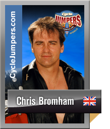 Chris Bromham – United Kingdom Chris Bromham is a Welsh motorcycle jumper who is known internationally for his spectacular long distance jumps. He rode his first motorcycle at the age of five. He left school at 16 and soon afterwards his interest in motorcycle became serious. At 17, he discovered jumping. In 1979, he jumped over 115 feet over fire at a show and in 1981, he leapt 28 cars before a crowd of 30,000. He has been a World Champion four times and the only motorcycle daredevil to have two entries in the Guinness Book of World Records. Chris has jumped 208 feet over 18 double-decker buses and 24s1 feet over 20 buses.