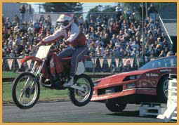 The above photos are of Corey while he was performing for Joie Chitwood's Chevy Thunder Show. If anyone has more information about this great rider and would love to share it with the rest of the world, please let me know. Corey Scott performed for years with the Joie Chitwood Chevy Thunder Show. Corey specialized in wheelies, the motorcycle-car precision driving exhibition and the motorcycle-pick up jump, where he jumped a moving truck with a ramp attached to the back. Scott performed in over 2,000 shows with the Chitwood organization. While with Joie Chitwood, he also performed the Human Battering Ram, the Slide For Life, the Leap for Life, the Aerial Wing-Walk, the Roman Rider, the Motorcycle Firewall Crash and Crash Rollovers. Corey eventually left the Chitwood organization and formed Scott's Super Stunts. In 1995, Corey won a ramp-to-ramp jump competition in Charlotte, North Carolina. This aired on ESPN. He took a break from stunts to recuperate from a head injury shortly after that, but in 1996, he went back to stunt performing. Corey died February 8, 1997 while performing a stunt at the Orange Bowl stadium in Miami, Florida. He was supposed to drive his motorcycle off a ramp and land into a net that was hoisted high into the air. Scott was suppose to grab the net upon hitting it, but he missed and fell 60 feet to the ground. He landed on his head and broke his neck. He had performed the stunt only four times before with no problem. Corey was 28 years old.