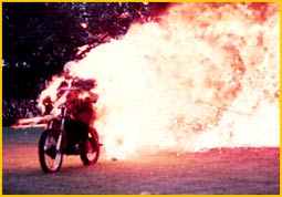 John "Golly" Goddard jumps over his team mates (Magnificent 7 Stunt Team) of which he was a member. John also going through 25 walls of fire. Both photos are circa 1982. Special thanks to Lee Sobol for the pictures and information