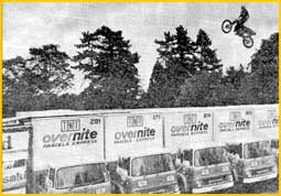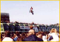 Above: John jumping 16 double decker buses circa 1983. The jump took place at the Chester Race Course in England. The distance over the buses was 132ft!