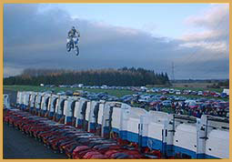 Three World Records in One Day – Shropshire, UK On November 12, 2000 at Renal Airfield, Oswestry, Shropshire UK, Jason Rennie broke three world records for motorcycle jumping. His first record was jumping over five moving cars head on. The front car was pushing the take off ramp. His total jumping distance was 122 feet. His next world record was jumping five lorries with his friend on the back of his bike. The total distance was 96 feet. His final record was jumping over 21 lorries. Jason started with eight and worked his way up to 21. The total jumping distance was 229 feet. Congratulations Jason. (Photos courtesy of Jason Rennie)