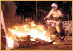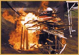 Left: Jim Avery is under the fiery ramp while Jim McDermott jumps over him. Right: Avery crashing through walls of fire during a county fair circa 1976.
