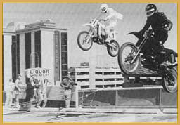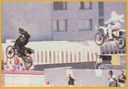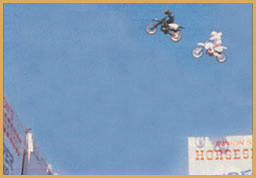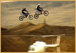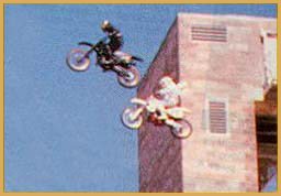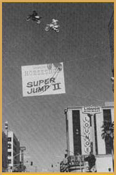 Left: "Super Joe" and Jumpin' Jamie Pamintuan. Right: Joe and "Holeshot Heidi" Henry jumping over a flying helicopter. No one else has attempted this stunt. "Super Joe", Jamie and Heidi performed five motorcycle "combination" jumps...all in less than 22 minutes. Joe's latest video, "Dared the Devil... Disciples of Evel" is available at Best Buy stores, Netflicks.com as well as Ebay. You can also order through Joe's site Superstunts.us.