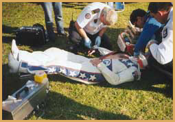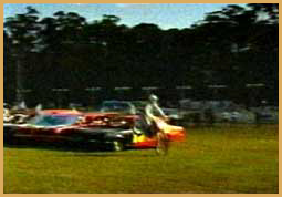 Norm would not back out on the show. The day before he cut the plaster cast from his leg, traded crutches for a walking stick and went to the arena to set-up for the show. Norm climbed on the bike and did a few speed runs and wheelies. He moved the ramp a little toward the landing end of the arena, preferring to hit the safety bales at the end of the arena rather than land short. On the morning of the show, Norm busied himself loading pyrotechnics, polishing the gear and doing pre-show press interviews. Lawrence Legend called in unexpectedly to wish Norm well, and add his support. Following a grand entrance Norm performed a series of precision wheelies and spectacular pre jump stunts as the cars were assembled onto the arena. Promoters pleaded with Norm to only attempt 10 cars but the press had all been about 12 cars. With the 11th and 12th cars in place Norm lined up the takeoff ramp from a standing start. Traction was hard to find, and despite a second gear start, Norm was unable to gain speed and it was clear he was in trouble. The takeoff was good and the flight was level, but Norm's rear wheel struck the 12th car. Norm was still on the bike when the front wheel hit the ground catapulting him onto his left shoulder and head.