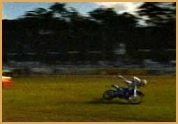 His last practice session four weeks earlier had gone badly. Glare from a polished ramp had momentarily blinded Norm and caused him to crash during practice for a relatively straight forward stunt. He injured his wrist, ribs and punctured a crankcase. He then performed four practice jumps during the next hour. The last of which resulted in the suspension bottoming out and the frame hitting the ground. The force transmitted through his ankle causing it to fracture.
