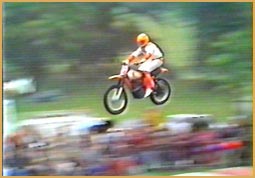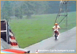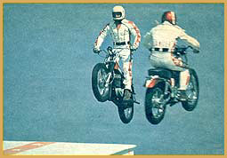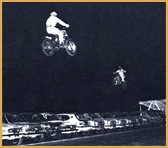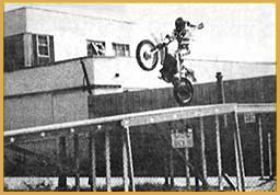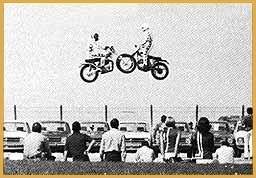 Gary Davis and Rex Blackwell jumping as "The Flying Cycles". After the team broke up Rex went on to do solo work. One of his solo stunts was jumping his motorcycle over two helicopters with the blades spinning. He cleared the helicopters, but just missed the last helicopter's blade upon landing. He also recreated the jump at Caesars Palace in the Houston Astrodome. He successfully made the jump. Rex did stunt work for television including the hit show, CHiPs. In 1977, he went to England to compete in a jump-off against Eddie Kidd.