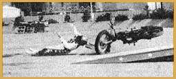 Special thanks to Lee Sobol for sharing these images! "CHiPs" television stunt Rex Blackwell was doing a stunt for the television show "Chips" in the 1980's but the landing wasn't perfect. His crash landing came as he was being chased by "CHiPs"; stars Larry Wilcox and Erik Estrada across Hollywood's famous Lot 2 set. The chase was ended by Rex clearing a 20 foot fence. But his front wheel missed the landing ramp and he crashed. Rex was able to walk away.