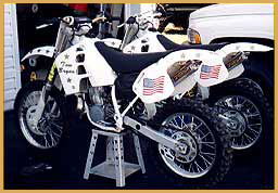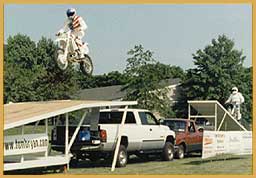 Left: This is what made Tom Bryan a top motorcycle performer. He has custom ramps specifically built for his shows as well as leathers and bikes. Tom prides himself in giving the audience a complete top notch performance. Right: Tom celebrating after his successful leap over 10 cars on June 10, 2000.