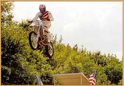 Tom Bryan hails from New Jersey and has been involved with motorcycles his whole life. As a child, his father bought him a mini-bike before he even got a bicycle. Tom went on to race motor cross and in the 80's, drag racing motorcycles. Tom then made the transition into the motorcycle jumping business. He used his experience as a martial arts expert and a motocross racer to help him prepare and perform each of his stunts. Tom is inspired by many of today's stunt riders like Bubba Blackwell and Robbie Knievel, but has the most admiration for Evel Knievel. Tom has had the pleasure of meeting Evel on several occasions. Tom even owns a limited edition Evel Knievel Signature Series California Motorcycle. Today Tom has stepped away from the cycle jumping business to concentrate on his very successful martial arts studio. Tom has Black Belts in Bushido Kempo, American Kempo, Tae Kwon Do and Ju-Jitsu. Here's a link to Tom Bryan Karate.